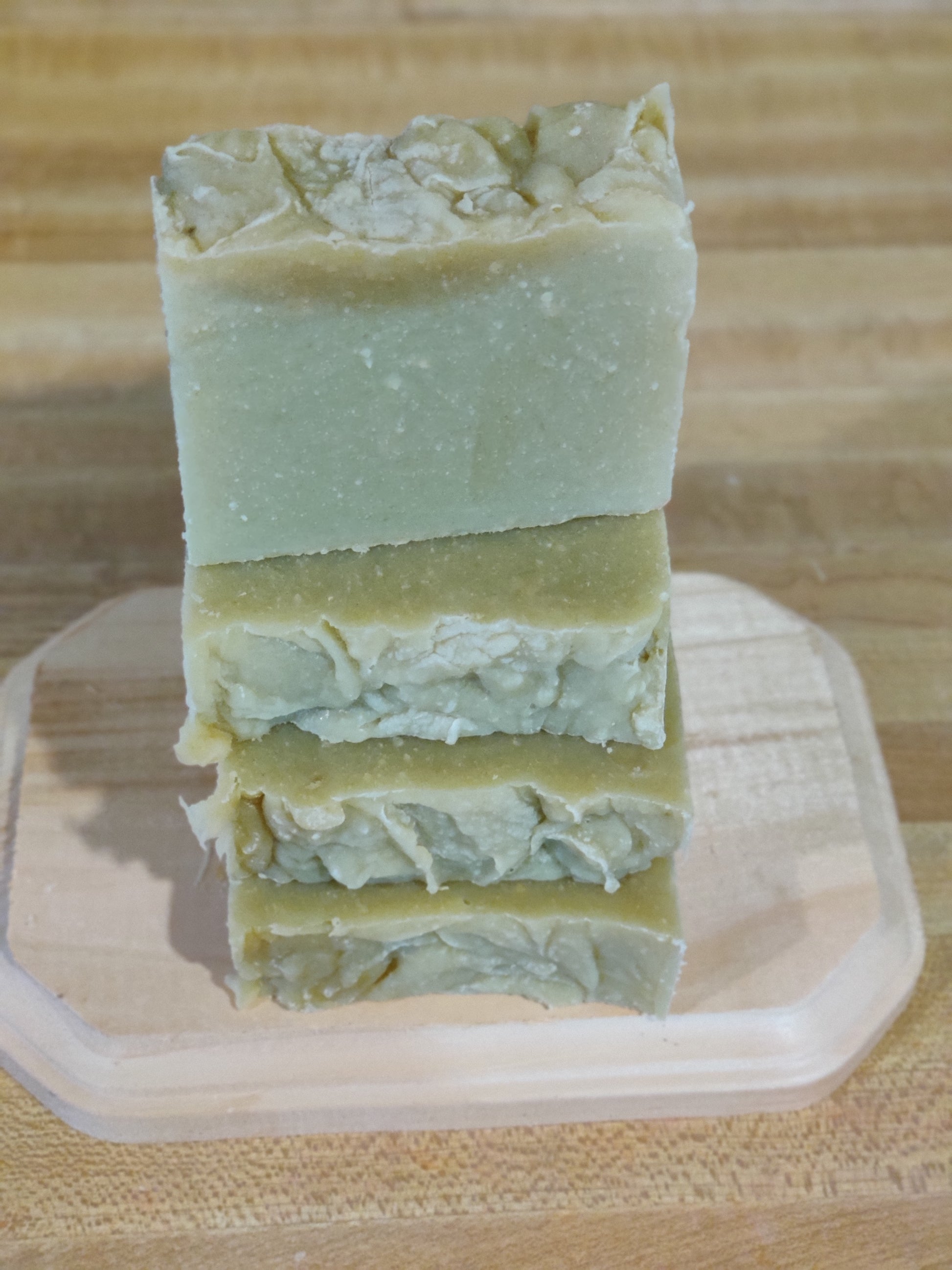Made with olive oil pomace, distilled water, coconut oil, shea butter, sodium hydroxide, castor oil, eucalyptus & spearmint essential oils, kaolin clay, spinach powder.
