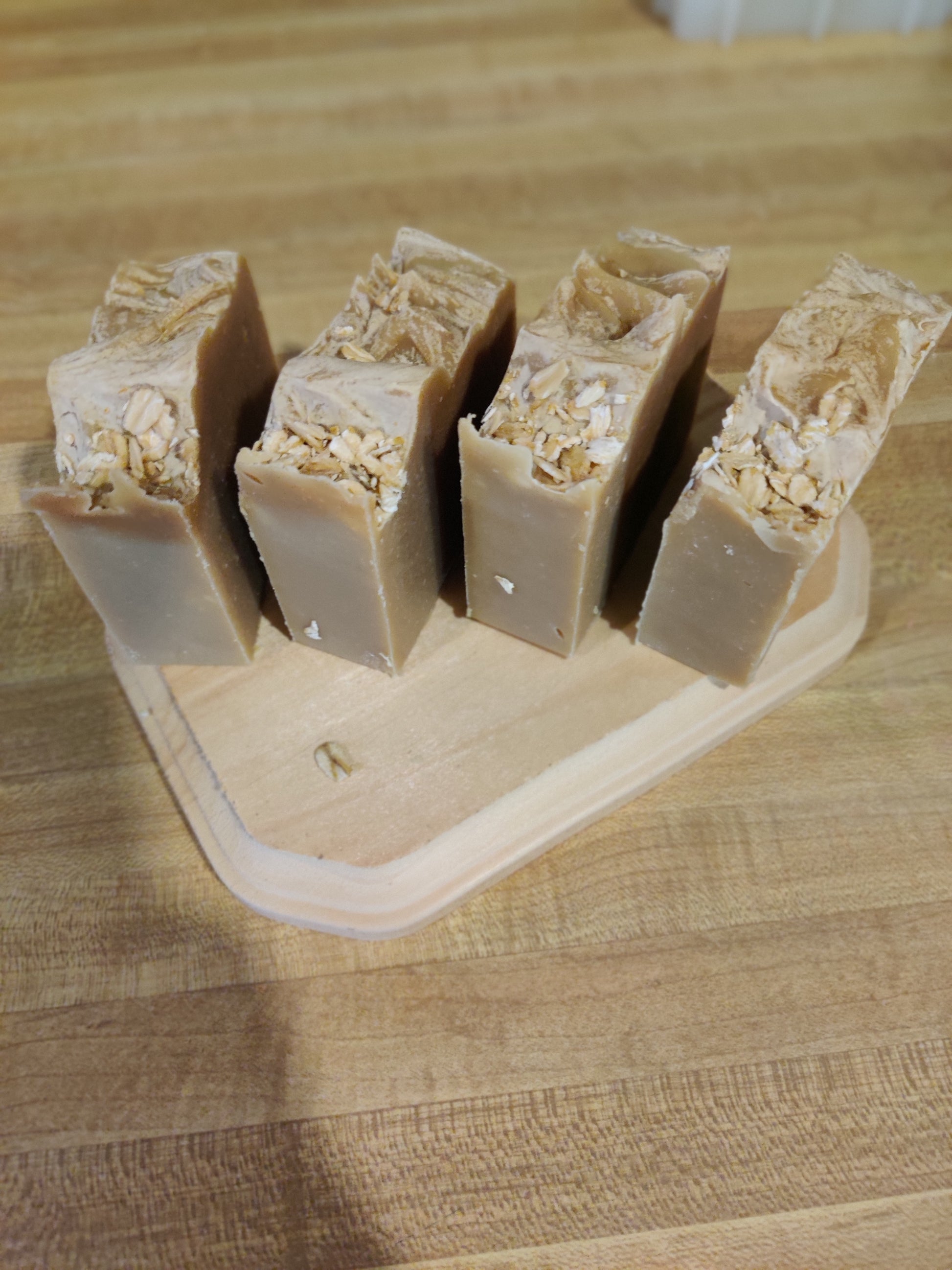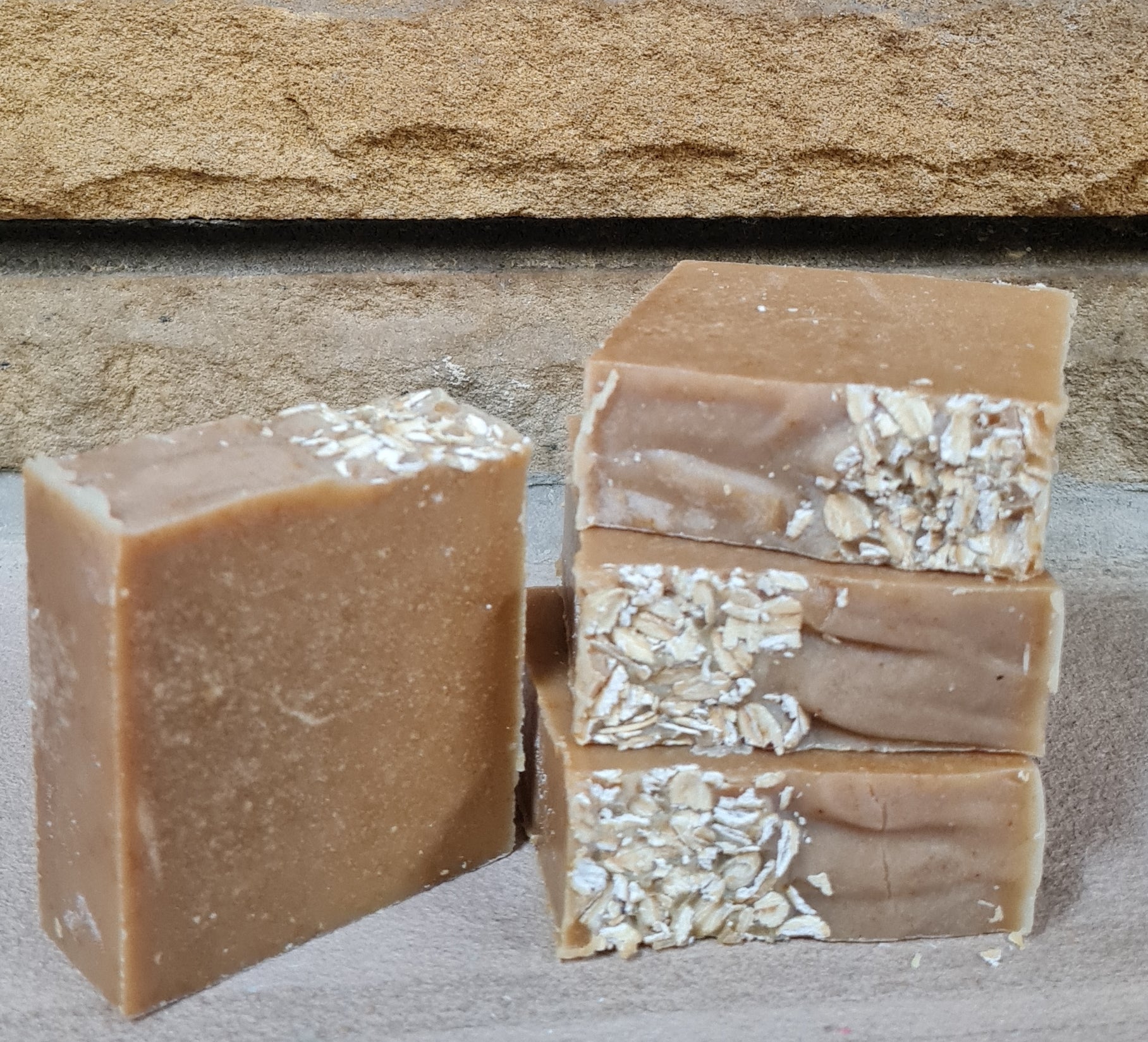 Made with olive oil, coconut oil, shea butter, castor oil, fresh goat milk, sodium hydroxide, raw honey, colloidal oats, oatmeal, fragrance.