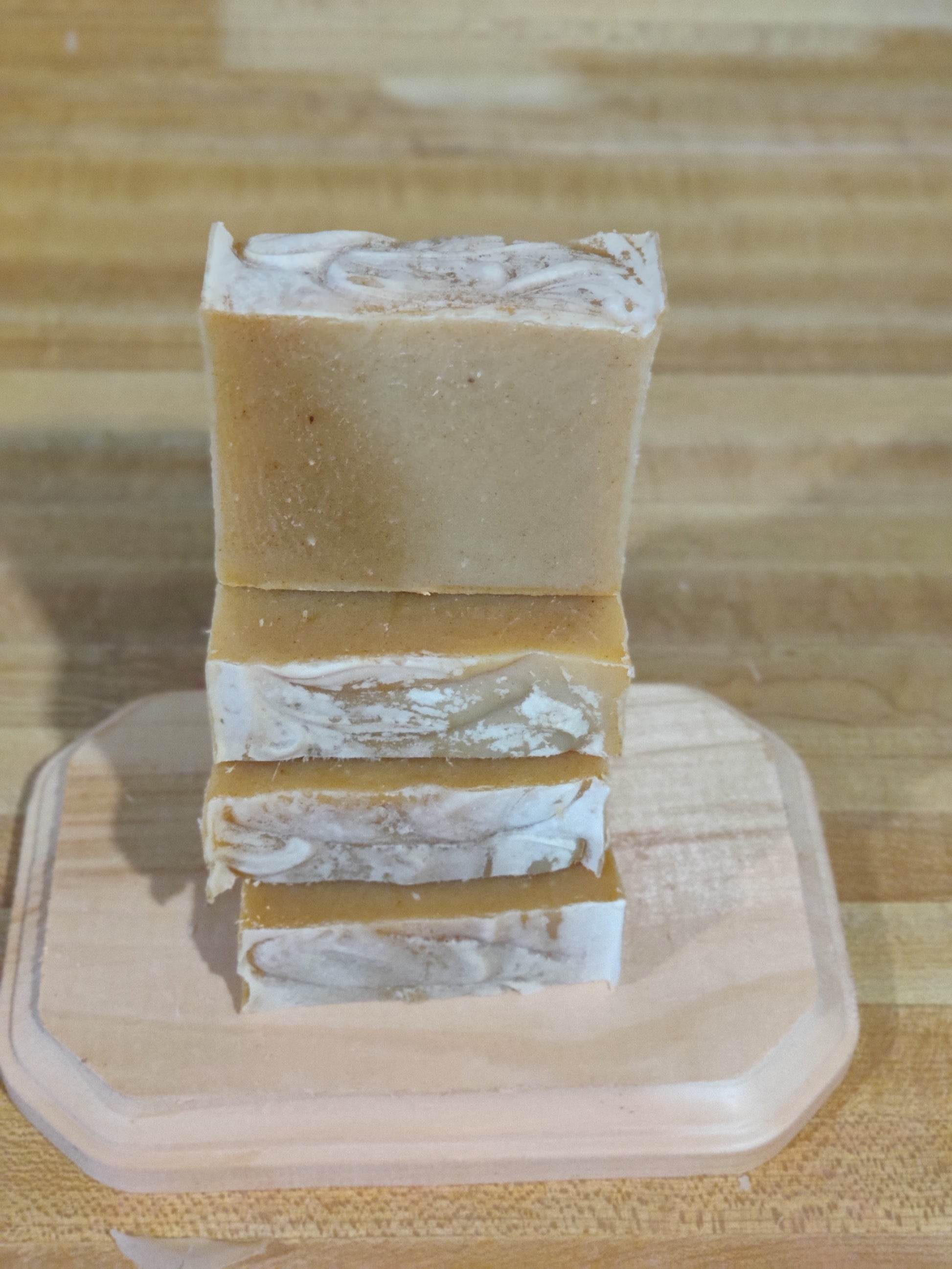 Made with olive oil pomace, distilled water, coconut oil, shea butter, sodium hydroxide, castor oil, sweet orange & peppermint essential oils, turmeric powder, kaolin clay.