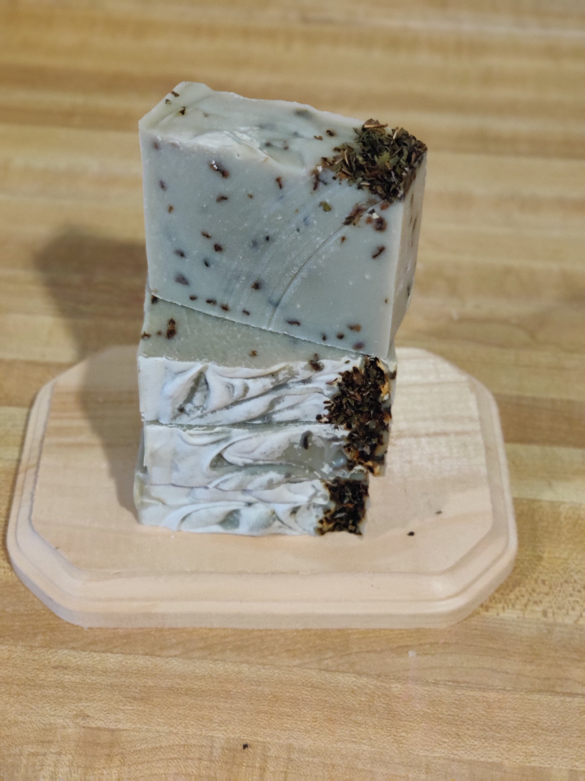 Made with olive oil pomace, distilled water, coconut oil, shea butter, sodium hydroxide, castor oil, peppermint essential oil, sea clay, kaolin clay, peppermint leaves.
